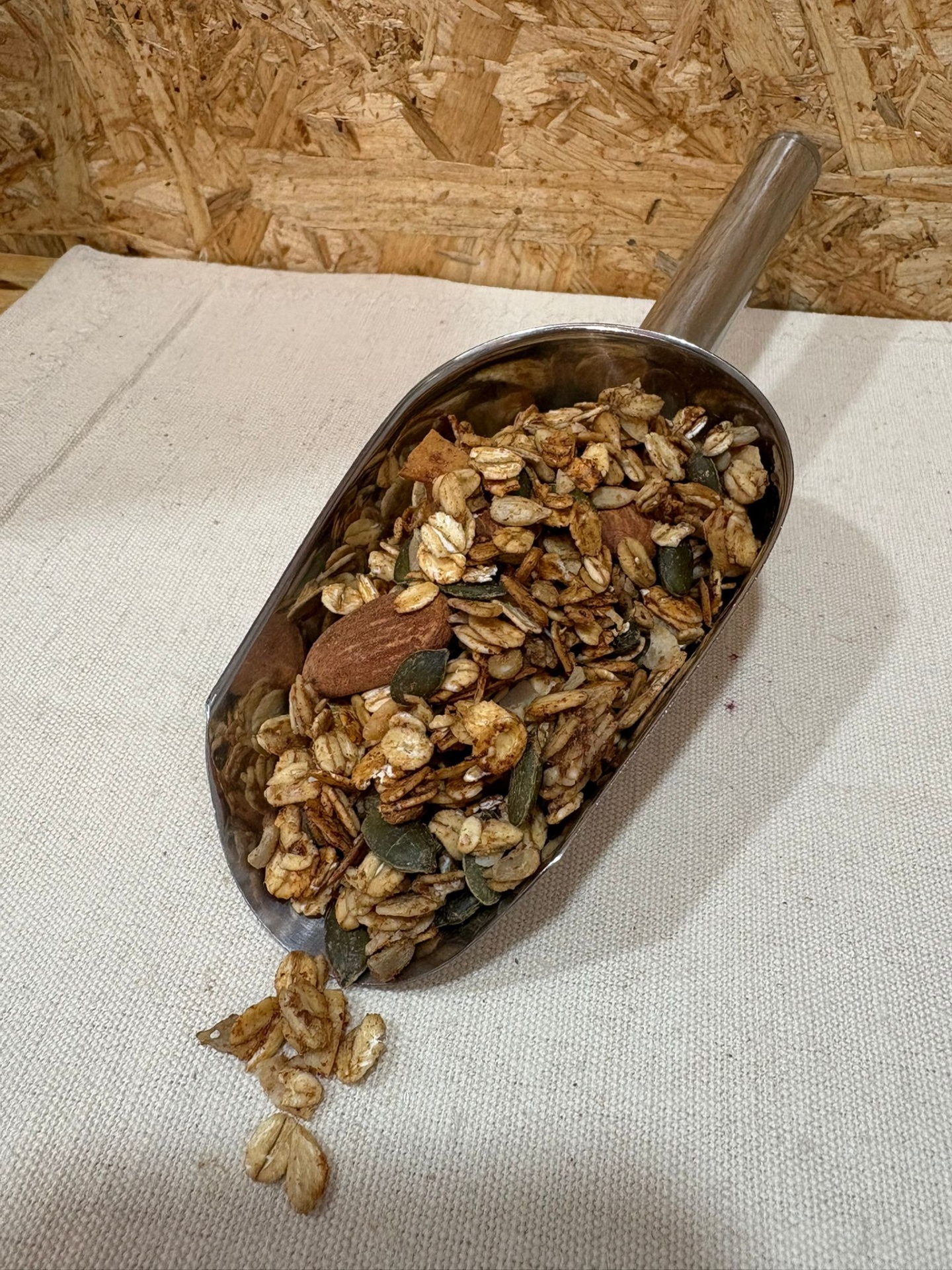 flocos de aveia isentos de glúten*, amêndoas* (17%), sementes de abóbora*, sementes de girassol*, tâmaras*, cajú*, óleo de coco*, canela* (0,6%) e gengibre* (0,8%).