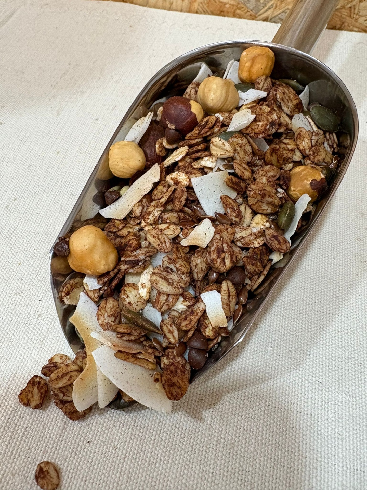 flocos de aveia isentos de glúten*, avelãs* (15%), coco laminado*, tâmaras*, sementes de abóbora*, sementes de linhaça*, óleo de coco*, pepitas de chocolate* (cacau 50% mínimo) (ingredientes: pasta de cacau*, açúcar de cana*, manteiga de cacau* e lecitina de soja*), sementes de chia* e cacau* em pó (2%).